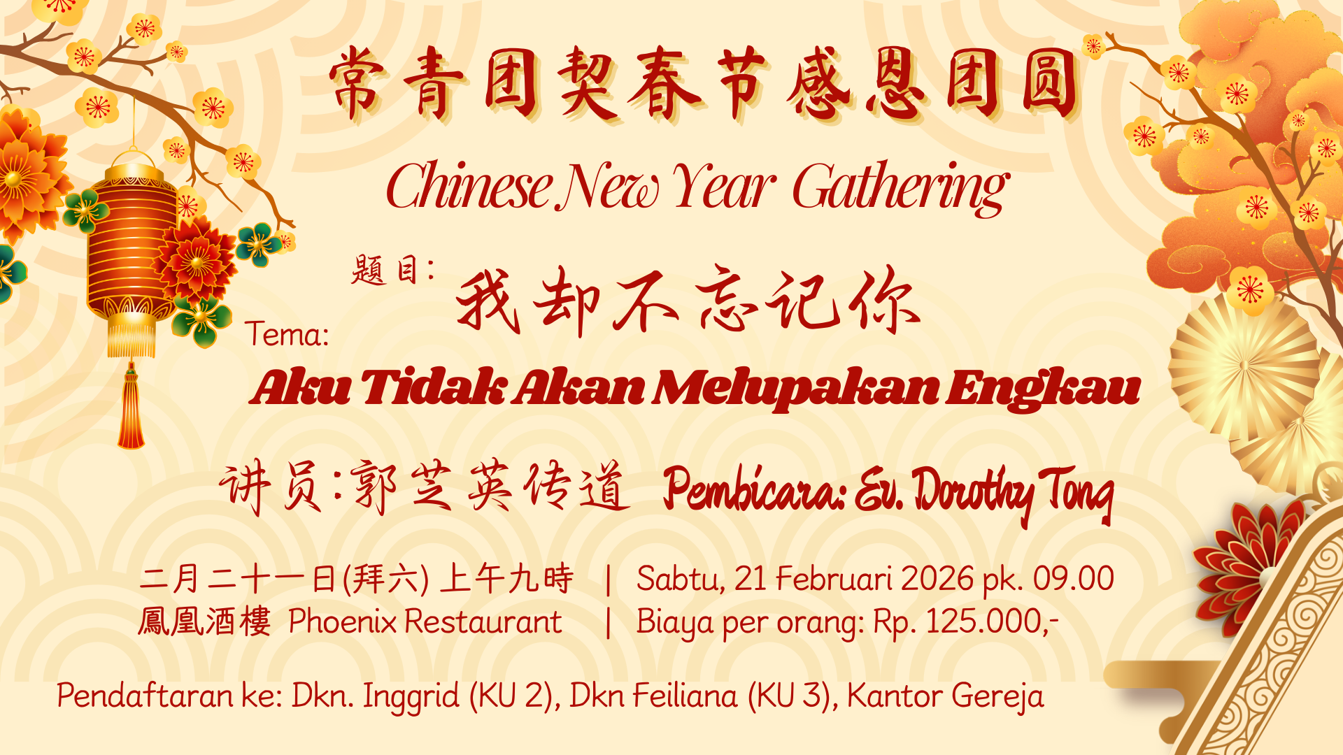 Mengundang setiap jemaat GII Hok Im Tong yang berusia 60 tahun ke atas untuk hadir di Chinese New Year Gathering Usinda, Sabtu, 21 Februari 2026, pukul 09.00 WIB. Dengan tema "Aku Tidak Akan Melupakan Engkau" , bertempat di Phoenix Restaurant.