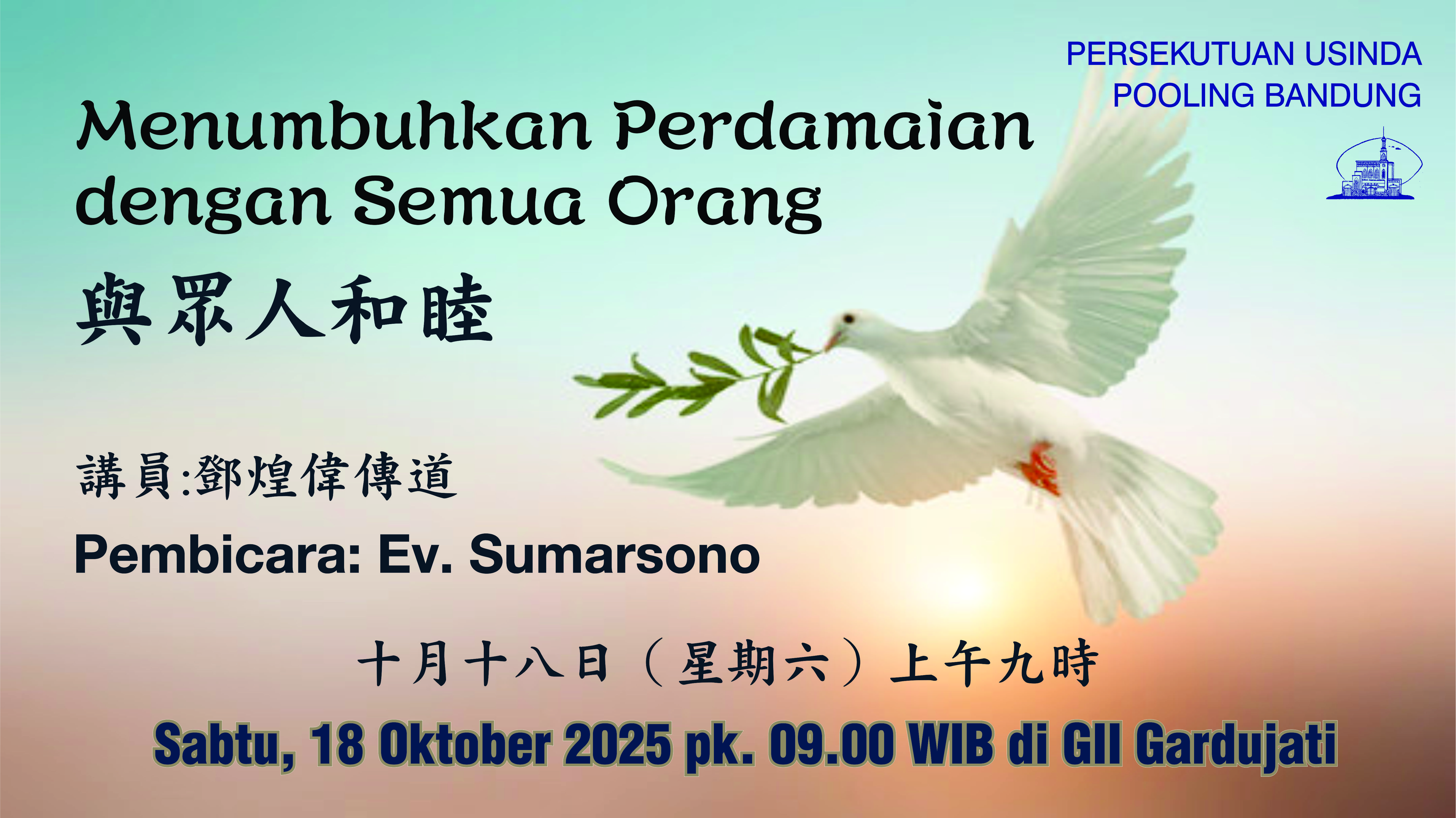 Mengundang setiap jemaat GII Hok Im Tong yang berusia 60 tahun ke atas untuk hadir di Persekutuan Usinda, Sabtu, 18 Oktober 2025, pukul 09.00 WIB. Dengan tema "Menumbuhkan Perdamaian dengan Semua Orang" , bertempat di GII Gardujati.
